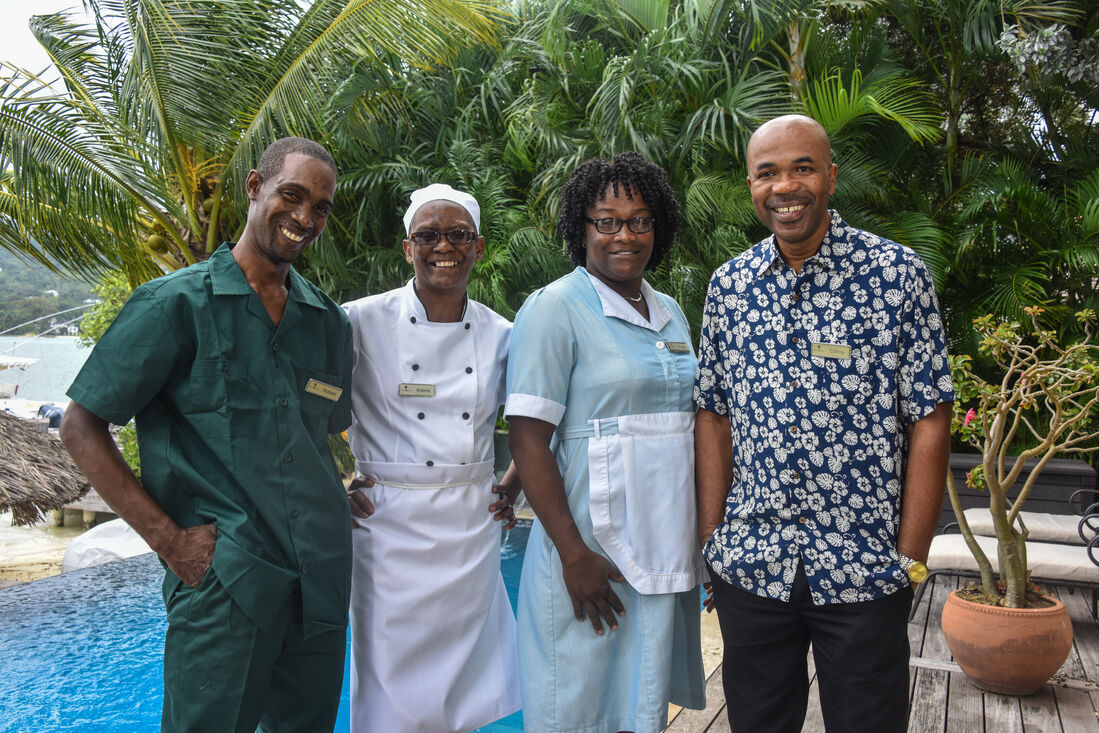 The four bedroom villa has en-suite bathrooms and provides a picturesque view of the ocean from each room. One bedroom is on the ground floor, while the remaining three are on the first floor. All three rooms on the first floor have classic Teak hardwood floors, 37’ HD LCD screens and split air conditioning. Authentic Jamaican antiques, elegant new pieces and original artwork give the villa a beautiful aura, making it unique among luxury villas Jamaica. All the bathrooms have marble, granite or natural stone finishing and walk-in showers.