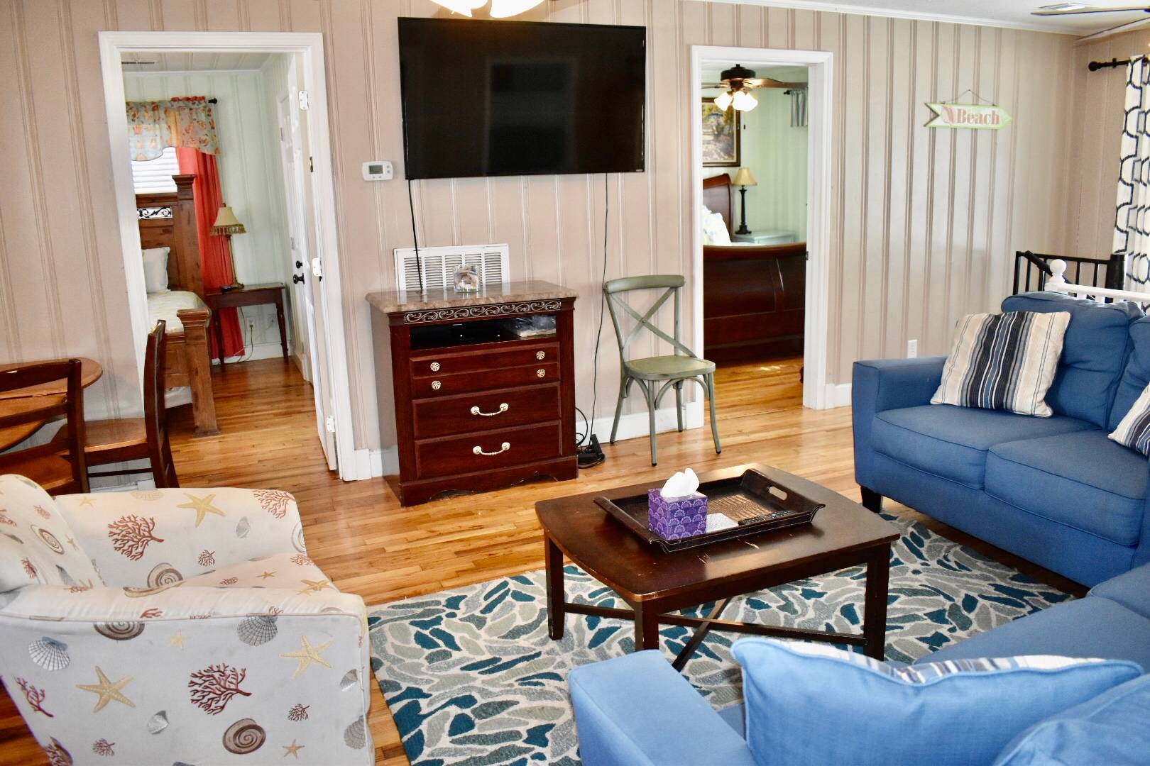 Open concept Living area with 46" TV, Free WIFI & cable TV with plenty of comfortable seating